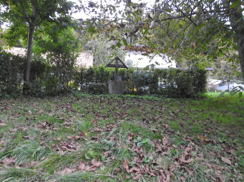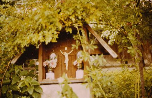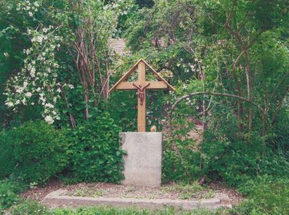 Beschreibung: Ein kleines Holzkreuz mit Holzdach auf einem hohen Sockel und Metallchristusfigur.